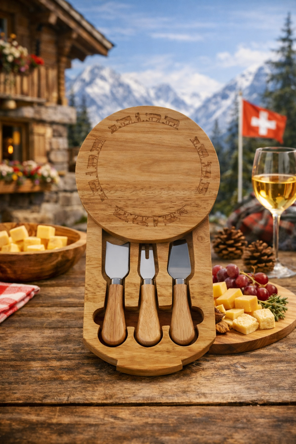 Käsebrett mit drei Käsemesser welches in jede Art von Küche passt. Ausserdem finden Sie hier weitere Käsebrettchen.