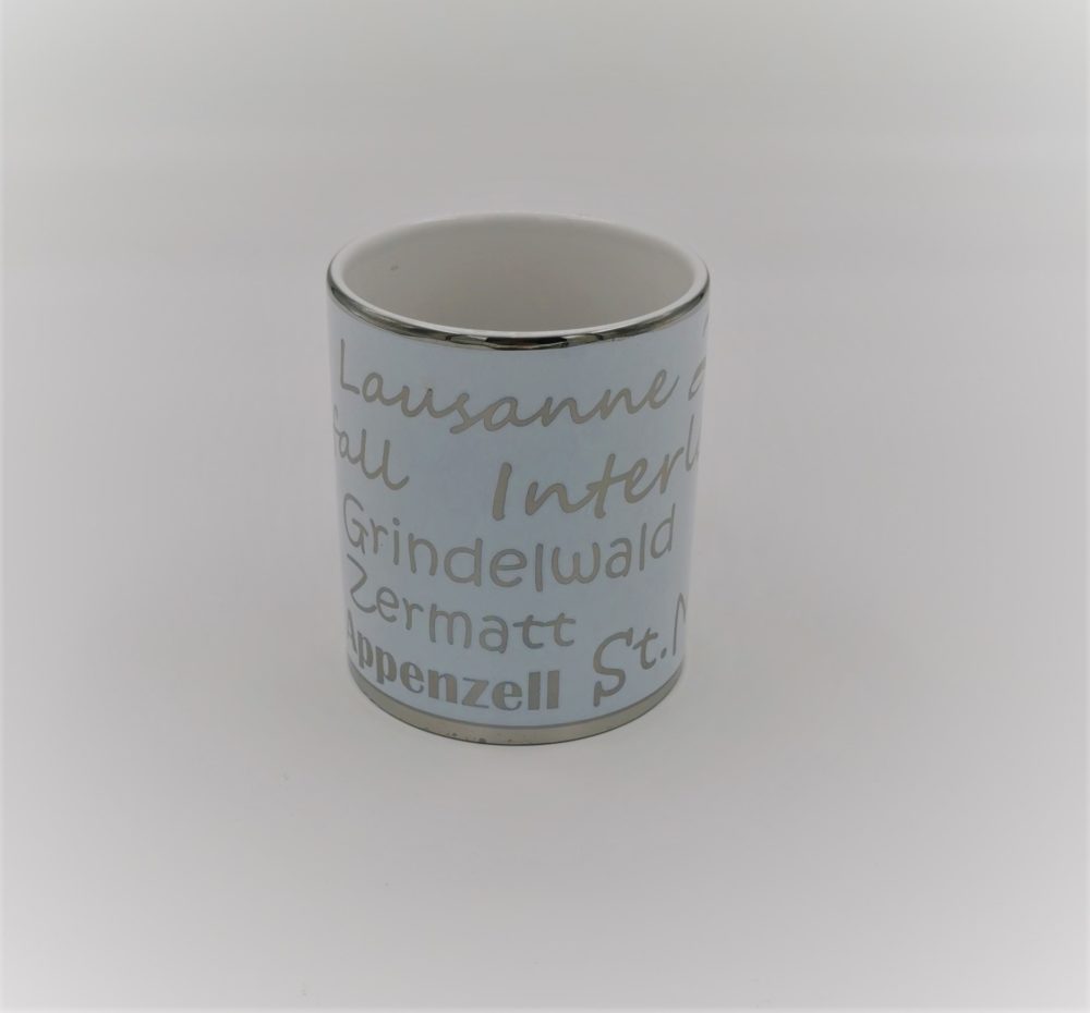 Schöne Tasse, weiss mit silbernen Ortsnamen.