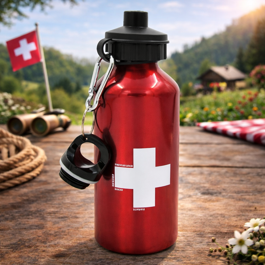 Trinkflasche mit CH-Kreuz für ein Picknick am 1. August.