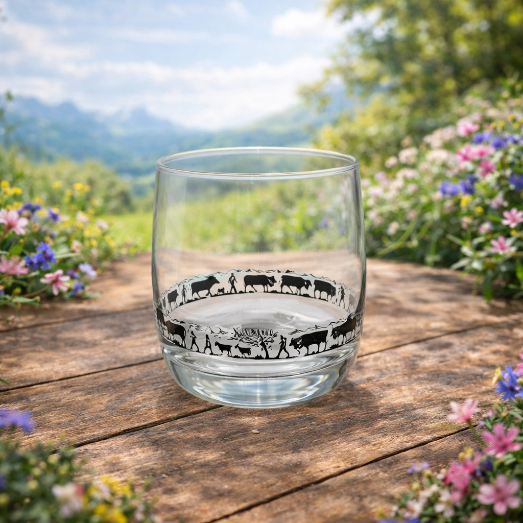 Schönes Wasserglas mit einem Alpaufzug rundum das Glas.